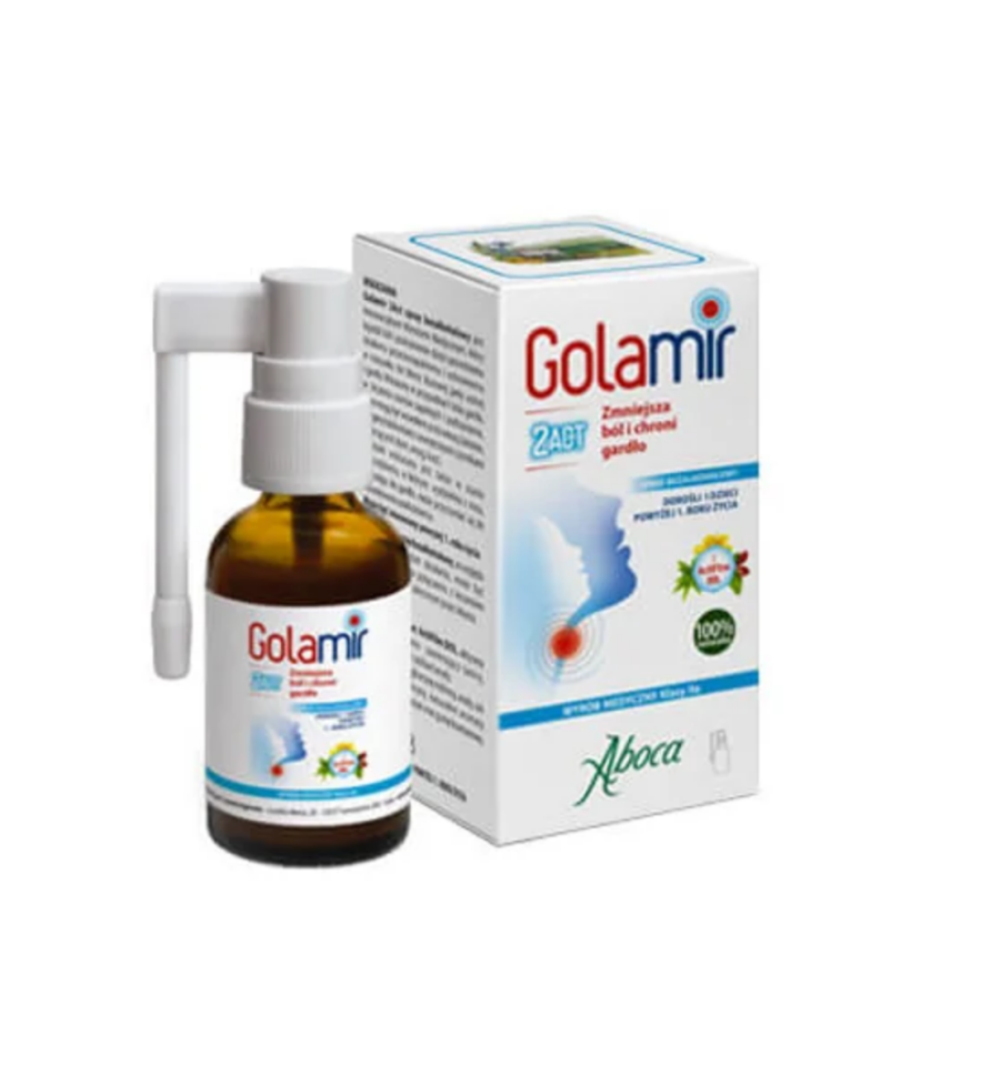 Golamir spray to preparat dla osób borykających się z bólem gardła i przeziębieniem oraz będących w trakcie leczenia stanów zapalnych i podrażnień jamy ustnej i gardła. Może być stosowany w przypadku dolegliwości wywoływanych przez wirusy, bakterie, alergeny lub kontakt z zewnętrznymi czynnikami drażniącymi, jak dym, smog i kurz. Produkt jest odpowiedni dla osób, które borykają się z wydzieliną z nosa spływającą do gardła i wywołującą podrażnienia.