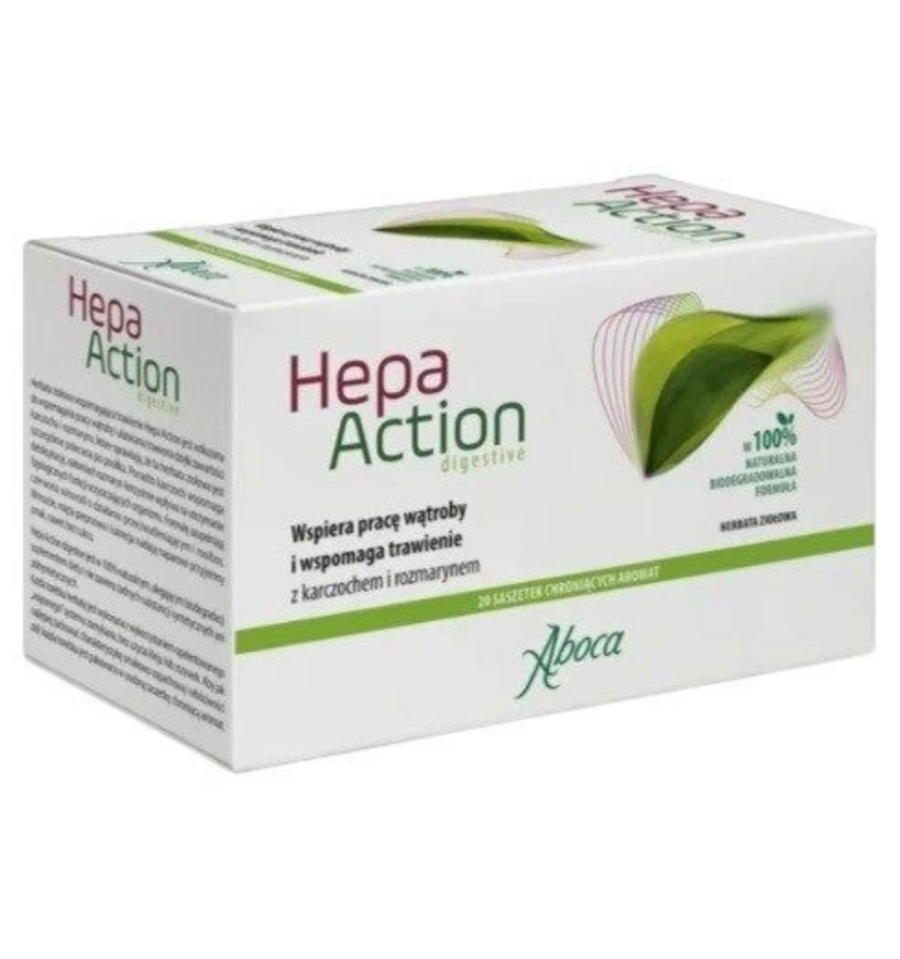 Aboca Hepa Action Digestive herbata wspierająca pracę wątroby i wspomagająca trawienie, z karczochem i rozmarynem. Dzięki zawartości karczocha i rozmarynu wspomaga pracę wątroby i ułatwia trawienie. Karczoch wspomaga detoksykację, Rozmaryn działa oczyszczająco na organizm, a dodatek Czerwonej Winorośli działa przeciwutleniająco.