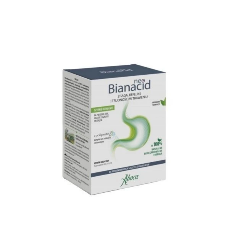 Aboca NeoBianacid to naturalny preparat w formie saszetek dedykowany osobom zmagającym się z objawami refluksu żołądkowo-przełykowego oraz zgagi. Unikalna formuła, oparta na opatentowanym rowiazaniu Poliprotect®, pozwala na szybkie stworzenie ochronnego filmu na błonie śluzowej, co zapobiega nadmiernej ekspozycji na działanie kwasów żołądkowych. Produkt jest w 100% naturalny, biodegradowalny i pozyskiwany z ekologicznych upraw. W opakowaniu znajduje się 20 saszetek.