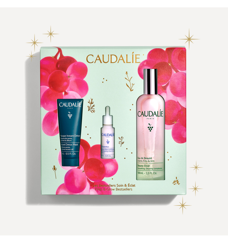 Trio Bestsellery Pielęgnacja i Blask to wyjątkowy zestaw trzech kultowych produktów Caudalie, stworzony, by dodać skórze energii, promienności i świeżości. Zestaw zawiera: Beauty Elixir (100 ml) – słynny rozświetlający spray tonizujący, Maskę Detoksykującą (15 ml) oraz Serum Vinoperfect (10 ml). To kompletna pielęgnacja inspirowana winoroślą, która upiększa cerę w zaledwie kilka chwil.