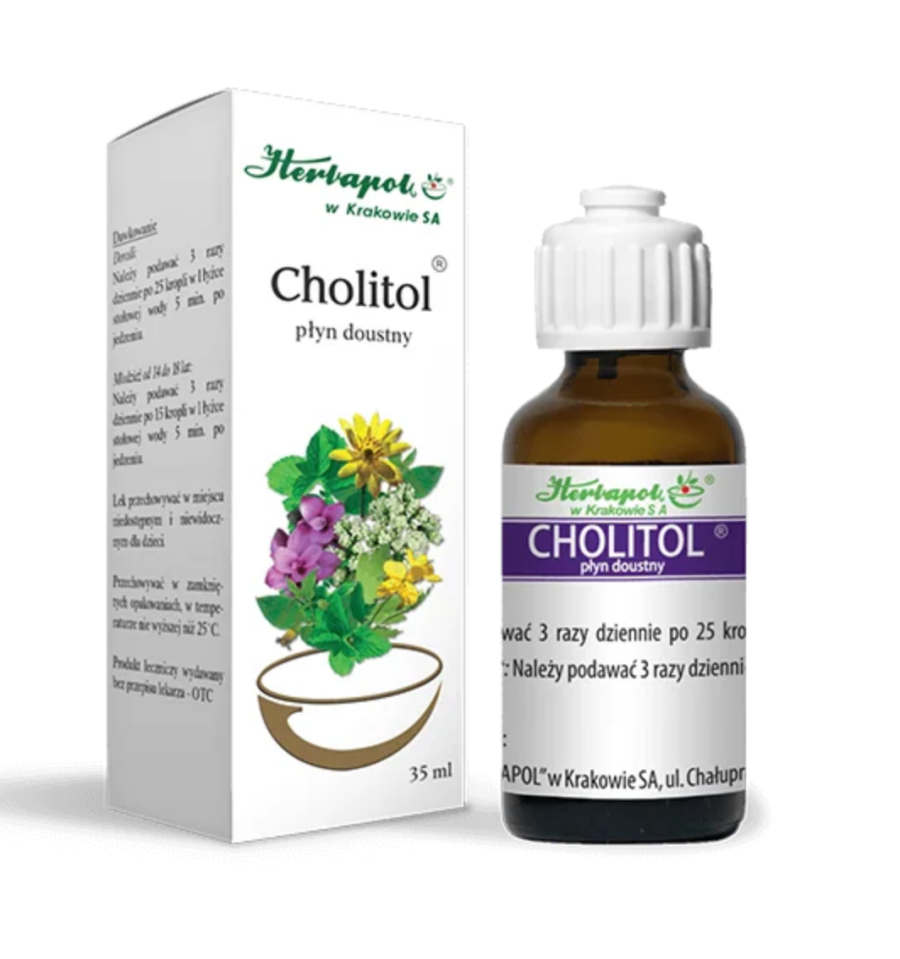 Cholitol, płyn doustny, 35 ml to złożony lek roślinny, którego składnikami czynnymi są: nalewka z kłączy kurkumy, sok z korzenia mniszka, nalewka kozłkowa, nalewka miętowa, nalewka z karczocha i nalewka z liści pokrzyku.