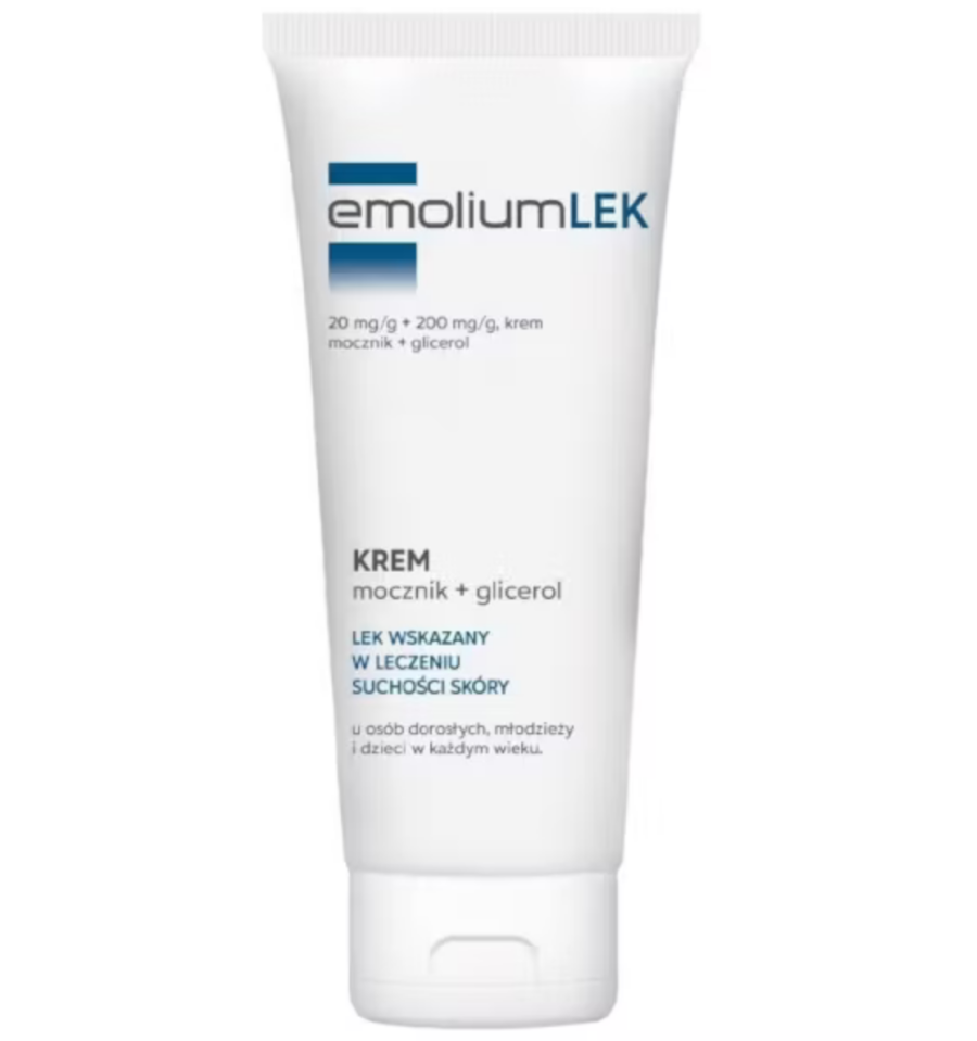 Lek emoliumLEK to krem o działaniu nawilżającym skórę, łagodzącym świąd i działającym ochronnie, zawierający mocznik i glicerol.