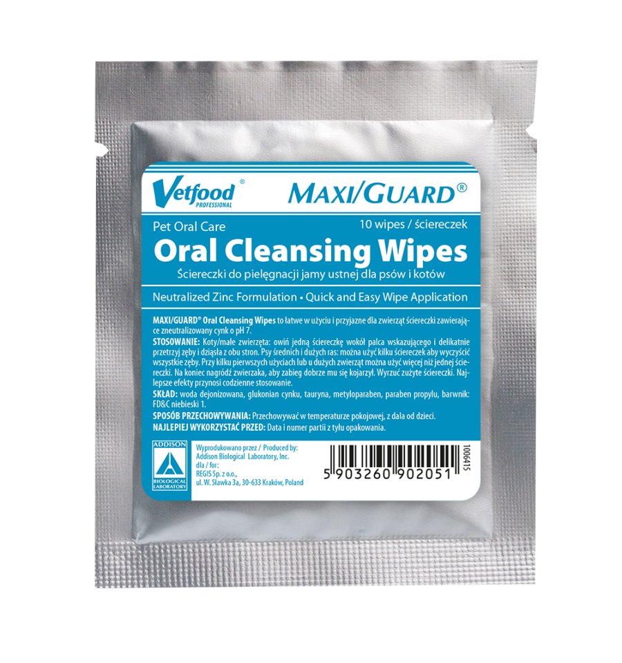 MAXI/GUARD Oral Cleansing Wipes to łatwe w użyciu i przyjazne dla zwierząt ściereczki zawierające zneutralizowany cynk o pH 7.