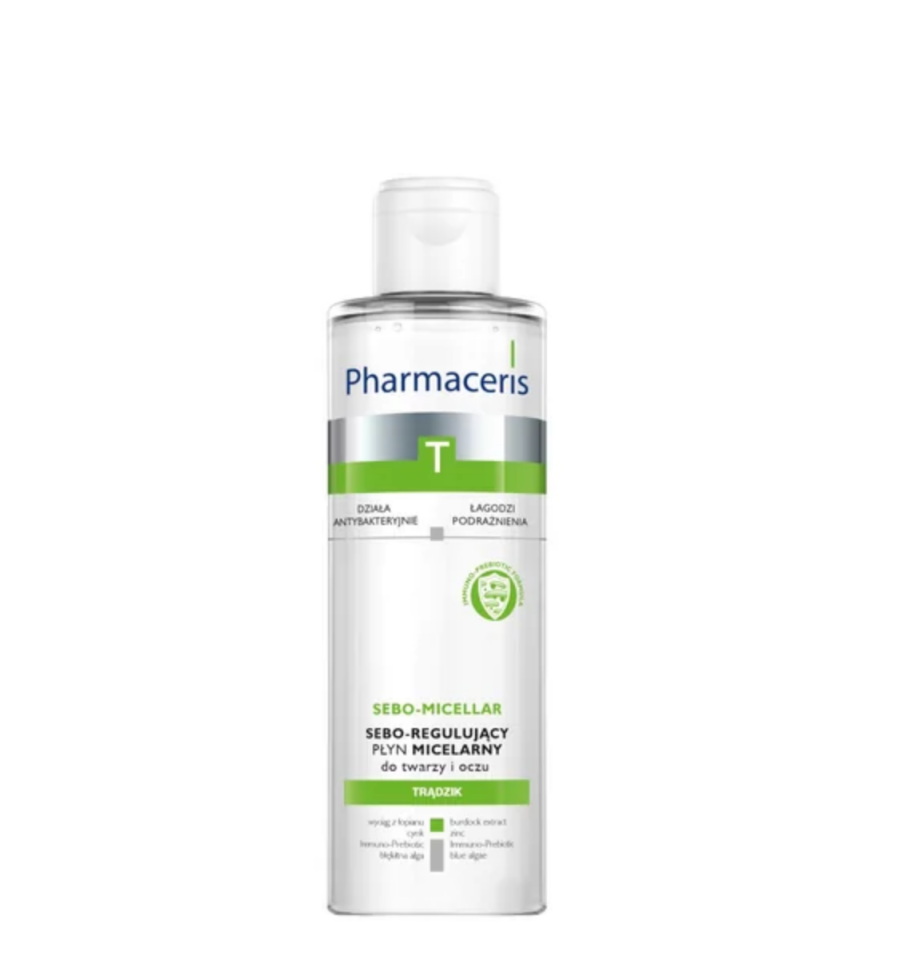 Antybakteryjny płyn micelarny Pharmaceris T Sebo-Micellar zawiera składniki, które pomagają usuwać makijaż i zanieczyszczenia środowiskowe, jednocześnie wspomagając codzienną pielęgnację cery trądzikowej.
