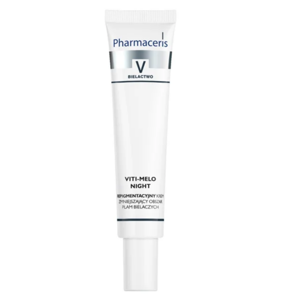 Krem repigmentacyjny na noc Pharmaceris V Viti-Melo Night zmniejsza widoczność plam skórnych, występujących przy bielactwie i innych zmianach pigmentacyjnych. Działa na głębokie warstwy naskórka, poprawiając jego funkcje regeneracyjne oraz wspomagając przywracanie naturalnego odcienia skóry.