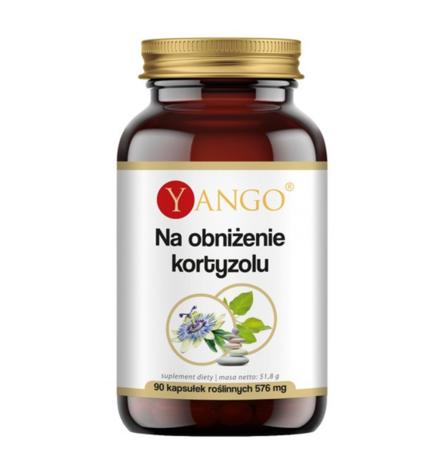 Yango Na obniżenie kortyzolu - to suplement diety w postaci kapsułek, który zawiera magnez, ekstrakt z kwiatów passiflory, z korzenia ashwagandhy, L-teaninę oraz witaminę B6. Produkt przeznaczony dla osób dorosłych.